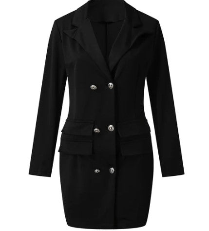 The Ava, double-breasted blazer dress for business women is the ideal choice for a professional and stylish appearance. With its classic double-breasted button placket and elegant blazer design, this dress offers the perfect combination of business suitability and fashionable chic. Ideal for the office and meetings, the Ava dress exudes timeless elegance and confidence.