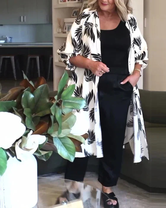 This casual jacket with lapel, button closure and a striking print adds a playful touch to any outfit. The loose silhouette and modern design make it the ideal choice for a stylish, effortless look.