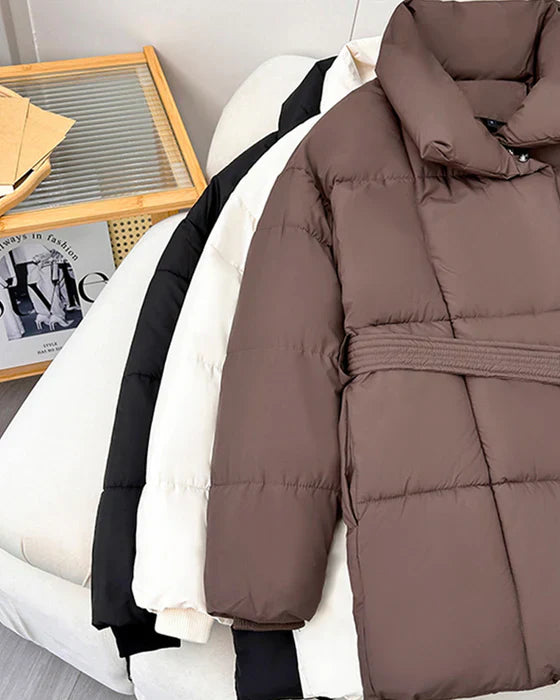 This casual quilted jacket with lapels and a simple color offers a stylish and minimalistic look. The comfortable design and light padding make it perfect for everyday use during chilly days.